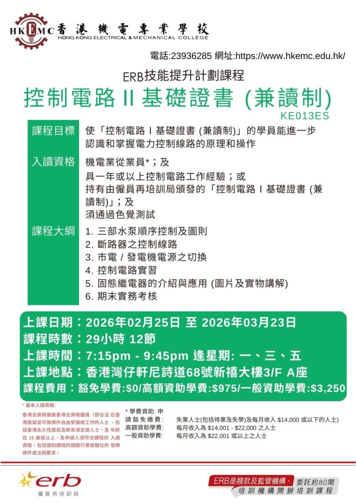 使「控制電路 I 基礎證書 (兼讀制)」的學員能進一步認識和掌握電力控制線路的原理和操作。