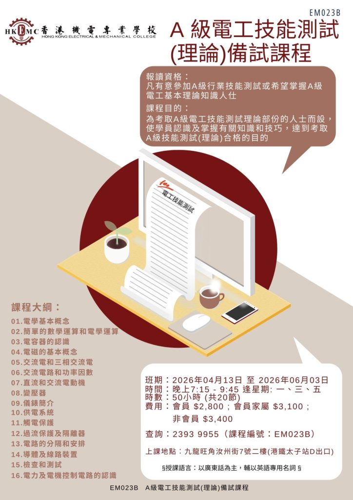 為考取A級電工技能測試理論部份的人士而設,使學員認識及掌握有關知識 和技巧,達到考取A級技能測試(理論)合格的目的