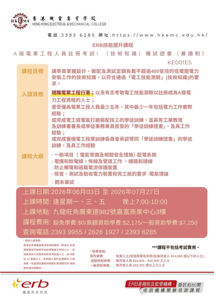KE001ES-A級電業工程人員註冊考試 I (技術知識) 備試證書 (兼讀制)