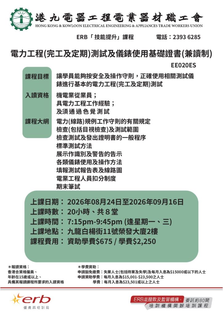 EE020ES 電力工程 (完工及定期) 測試及儀錶使用基礎證書 (兼讀制)