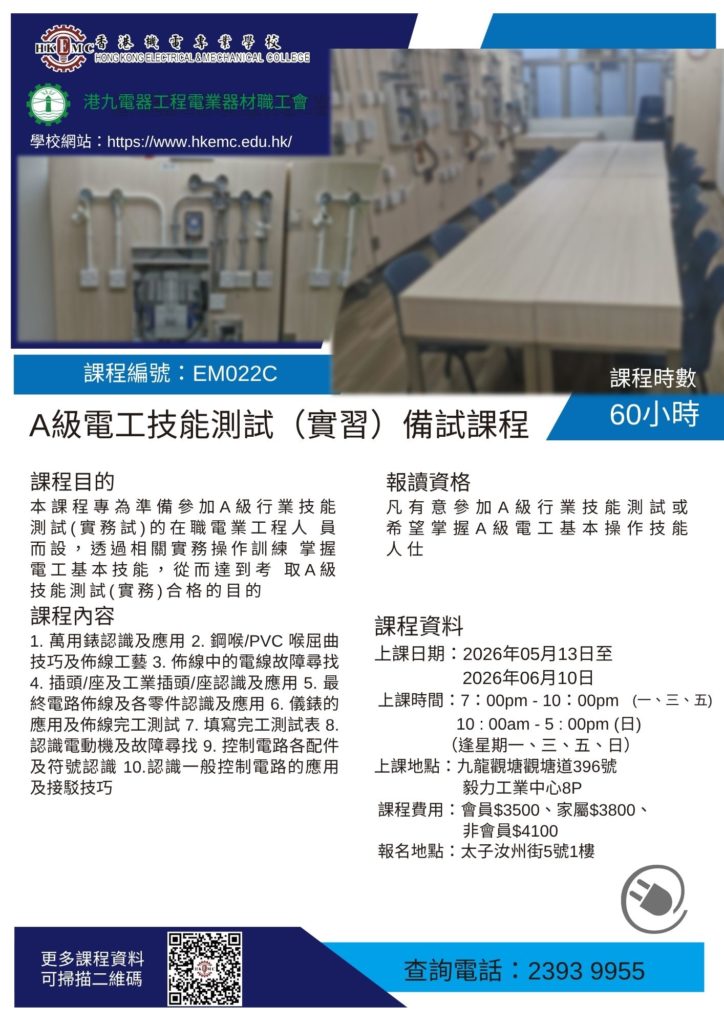 專為準備參加A級行業技能測試(實務部份)的在職電業工程人員而設,透過有關的實務操作訓練,從而掌握電工基本技能,達到考取A級技能測試(實務)合格的目的。