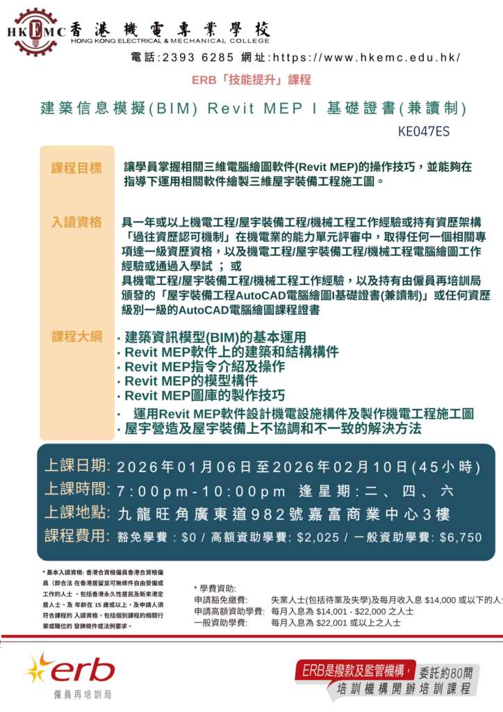KE047ES-建築信息模擬 (BIM) Revit MEP I 基礎證書(兼讀制)